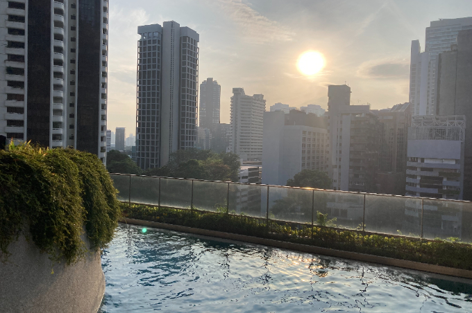 特に印象的なのが、プールのあるテラス。水面の向こうには高層ビル群が広がり、都市の真ん中にいることを思い出します。